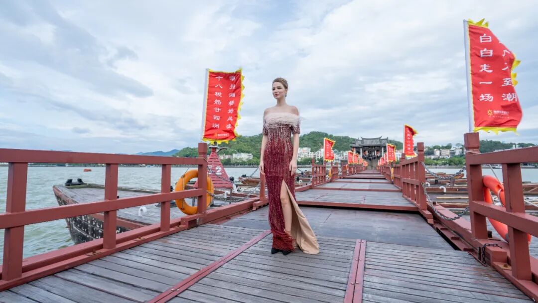 模特們穿戴典雅年夜氣的婚紗和號衣,在廣濟橋得天獨厚的天然美景中徐徐走過,將潮州婚紗晚號衣brand的高端品德與浪漫氣味展示得極盡描摹。