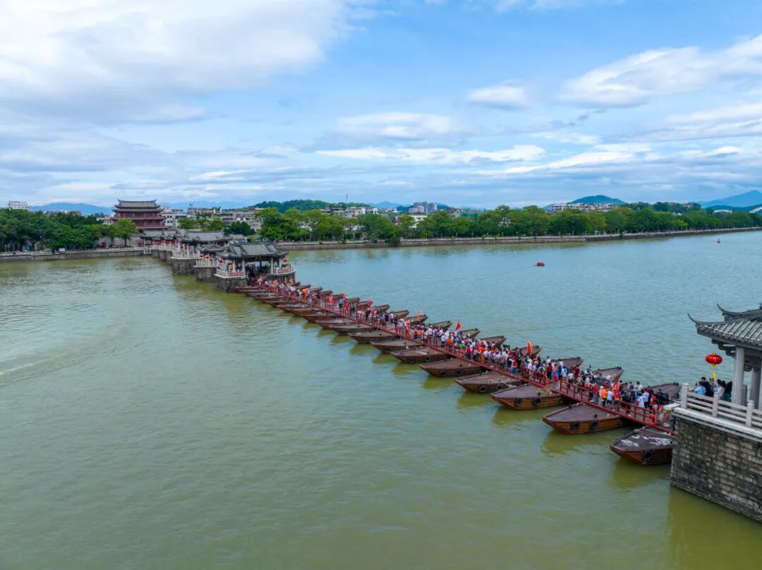 上午9點,廣濟橋的迎客典禮正式拉開尾聲,來自全國各地的游客在導游們的率領下,在廣濟橋邊打卡留念,留下難忘的旅途回想。